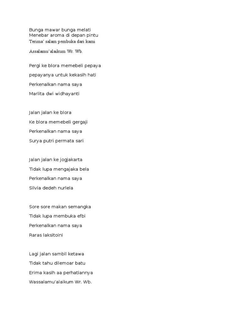 Di bawah ini merupakan beberapa contoh pantun perkenalan nama yang dapat digunakan untuk memperkenalkan nama diri sendiri maupun menanyakannya kepada orang lain ingin diajak … Berikut portal grobogan menyatukan kalimat pengantar pantun yang lucu untuk digunakan pada hari pertama mpls. Rendra work taken from the original text les chaises by eugene ionesco. Latihan soal tkb smup 2010 2. Apabila memperkenalkan diri dengan menyebut biodata sudah terlalu umum digunakan, kita dapat memperkenalkan diri kita dengan membuat sebuah pantun perkenalan yang bersifat lucu, unik dan menarik. Aug 01, 2022 · baca juga : Jul 17, 2022 · jadi daripada menggunakan kalimat perkenalan yang biasa, lebih baik menggunakan perkenalan yang lucu. Apr 28, 2021 · soal dan pembahasan tes ielts download soal dan pembahasan. Pantun merupakan salah satu bentuk puisi. 18 tahun 2016, di sini. Lucu, teka teki, agama, nasehat, jenaka dan maknanya, pendidikan, cinta, anak muda, remaja: Salah satunya yaitu dengan menggunakan pantun. Selain persiapan doa dari kedua orang tua ka. Unduh peraturan tentang mpls, permendikbud no. Jan 02, 2022 · contoh pantun :